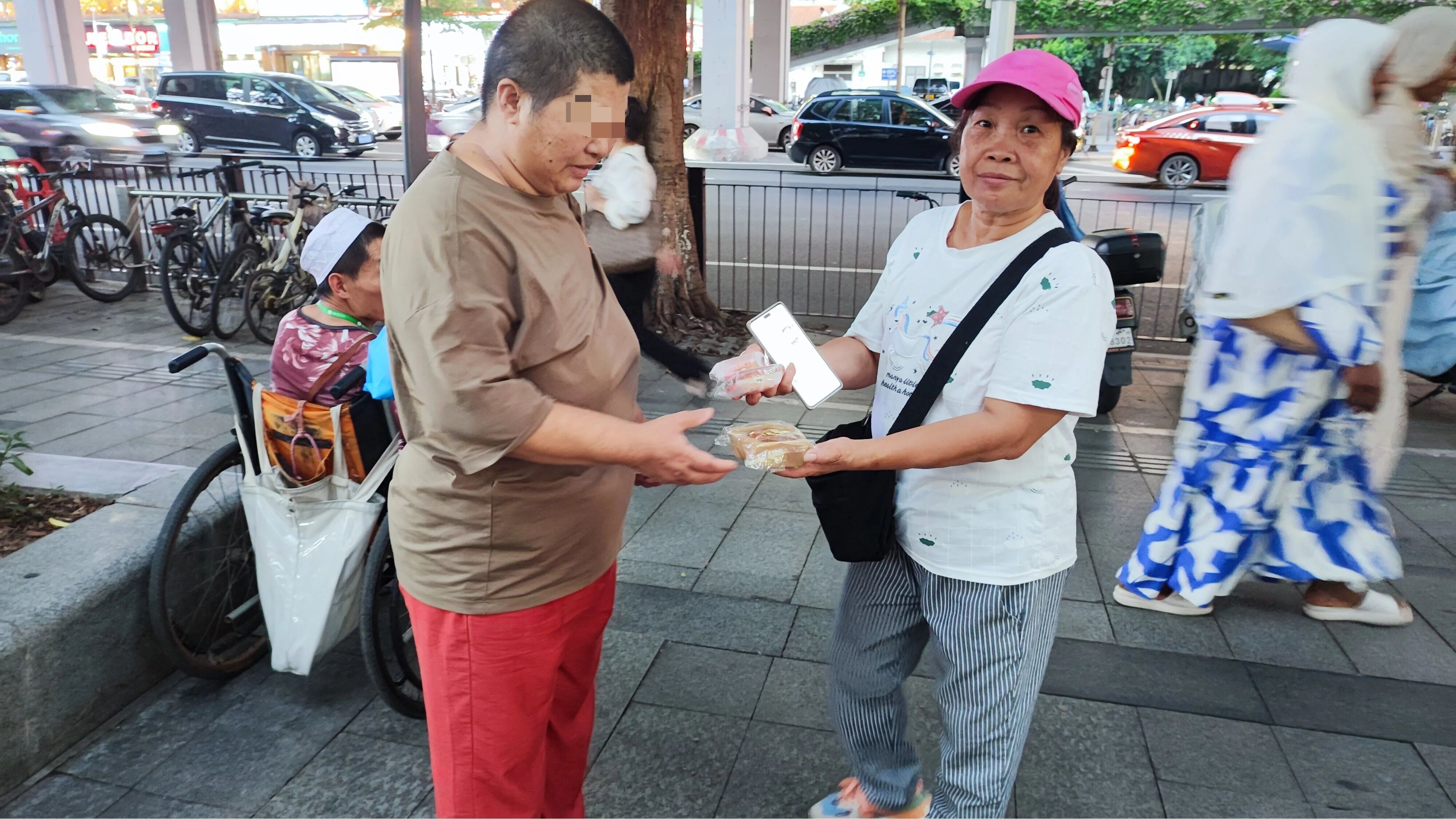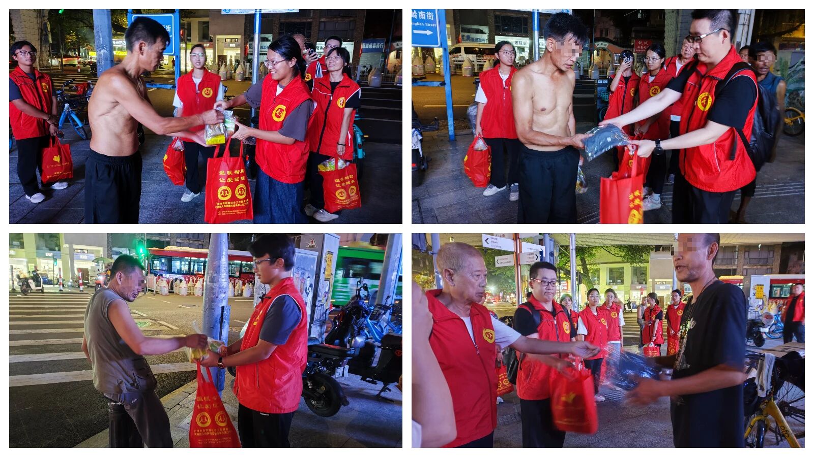 9 月26日晚,距离双节正式到来还有几天,来自广外艺的6名新生志愿者与两名骨干志愿者早早来到人民路集合。他们穿上红色志愿服,搬起装满慰问礼包的袋子,沿着街友们常停留的路段出发——高架桥下、公交站旁、公园角落,每一个可能有街友的地方,都出现了志愿者的身影。 “阿伯,中秋国庆快到了,给您送份月饼和吃的,祝您节日快乐!” 志愿者小滔蹲下身,将礼包递到一位街友手中。回复他的是一张腼腆的笑容,轻声说了句 “谢谢”。志愿者陈超华则带着短袖挨个询问:“你要不要衣服?我们买了全新的短袖”,简单的互动里满是温情。 当天,志愿者们走遍了多个重点区域,将数十份慰问礼包一一送到街友手中。而剩余的礼包与月饼,也在节前的外展工作中全部派发完毕 —— 从清晨到日暮,社工与志愿者们用脚步丈量着城市的温度,让每一份善意都精准抵达。